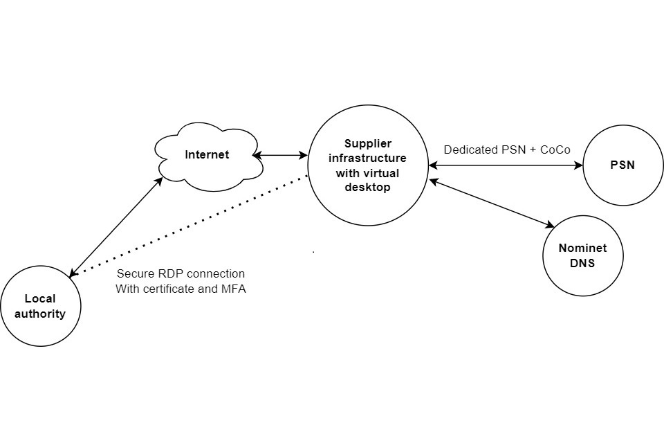 Diagram 1 shows the supplier infrastructure with a virtual desktop. This infrastructure enables traffic to and from the internet with traffic to a local authority or other user. A secure remote desktop protocol connection with certificate and multi factor authentication is set up from the supplier to the local authority. The virtual desktop has a dedicated connection to the PSN as well as a Nominet DNS connection.