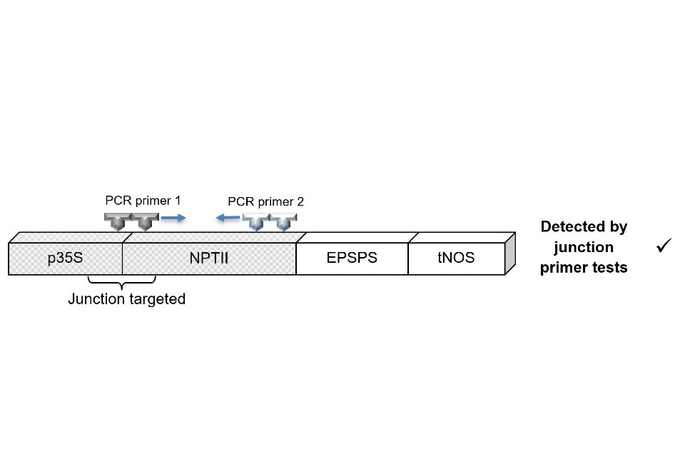 A bar with segments labelled from left to right: p35S, NPTII, EPSPS, tNOS with p35S and NPTII coloured as "Junction targeted" and outside the bar reads Detected by junction primer tests with a check mark