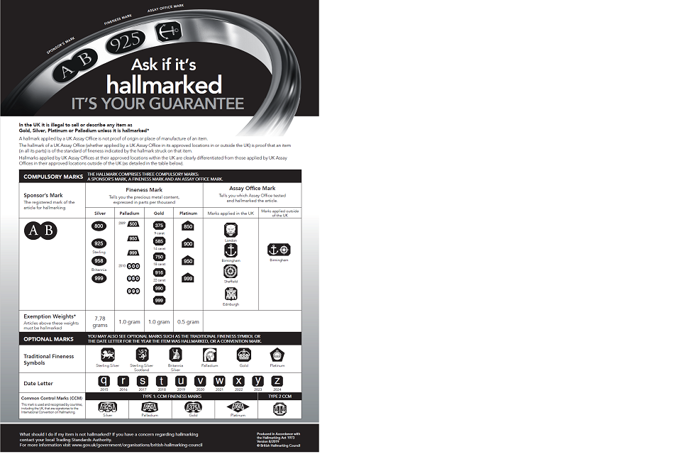 Under the Hallmarking Act 1973 all dealers supplying precious metal items must display a notice explaining the approved hallmarks. This must be in the form produced by the British Hallmarking Council.