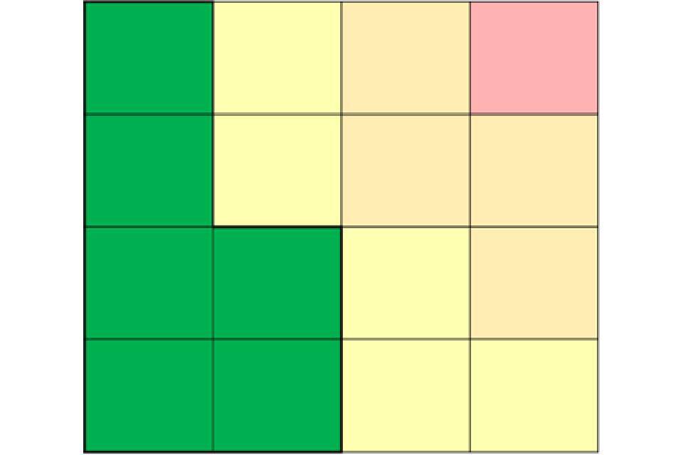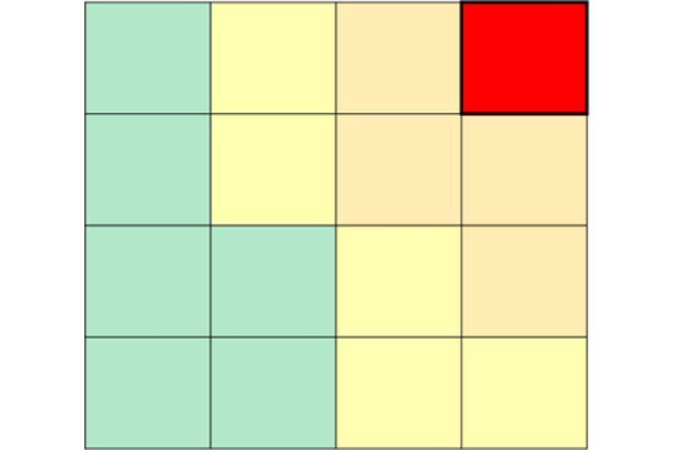 Yellow and amber alert assessments cover a range of potential impacts (for example impacts on specific vulnerable groups (such as rough sleepers) through to wider impacts on the general population) as well as the likelihood (low to high) of those impacts occurring. This additional information should aid making decisions about the appropriate level of response during an alert period. Within the alert that is issued, the combination of impact and likelihood will be displayed within a risk matrix as illustrated below.