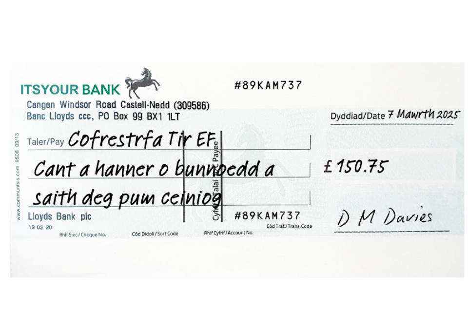 Mae’r geiriad “Taler Cofrestrfa Tir EF Cant a hanner o bunnoedd a saith deg pum ceiniog” ar ochr chwith y siec. Mae’r dyddiad “7 Mawrth 2025” ar ochr dde uchaf y siec, gyda’r swm “£150.75” mewn rhifau yn y blwch ar yr ochr dde o dan y dyddiad. Mae’r llofnod o dan y swm.