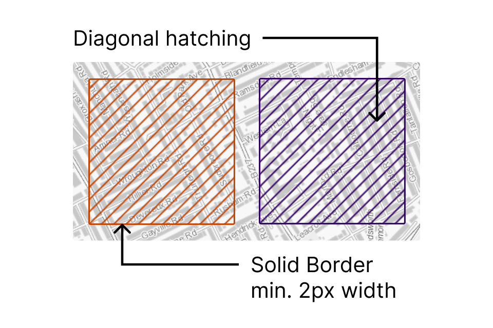 How to show them: use diagonal hatching with a minimum border width of 2 pixels to show site allocations on the map. The colour to use will depend on the policy theme, which we’ll set out later.