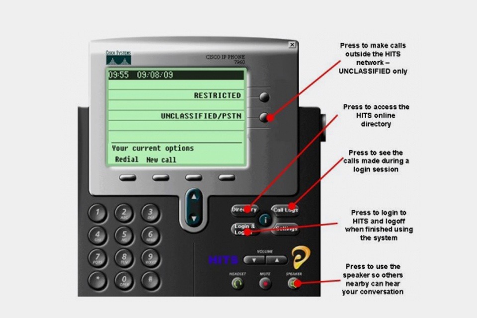 Graphic showing various buttons controls on the High Integrity Telecommunications System, such as how to make calls outside the HITS network, access the HITS online directory, see calls made during a login session, how to log in and out, and how to use the speaker function.