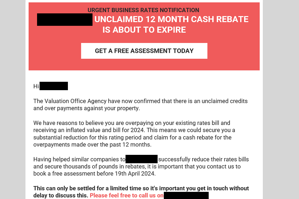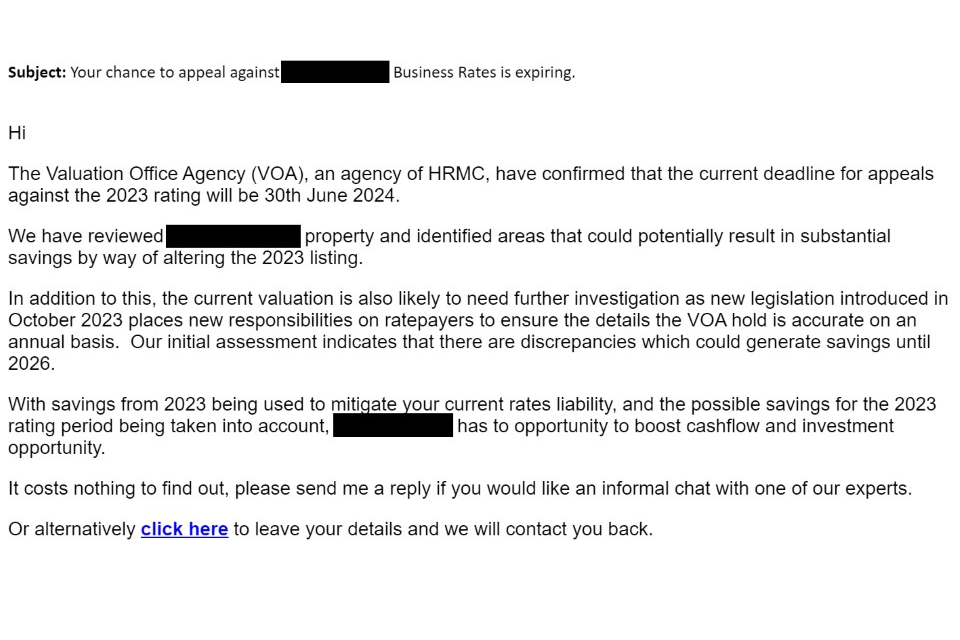 Beware of false claims about upcoming deadlines. This might be to appeal your business rates valuation or Council Tax band before a set deadline. If you are not sure, contact the VOA.