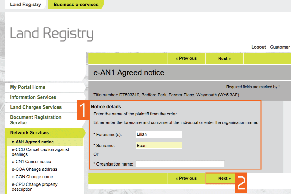 - As the Agreed Notice protects a charging order, you need to add the name of the plaintiff (the person or organisation claiming the interest). The full name of the plaintiff must be entered. If there is more than one person you only need to enter one name at this stage. The other names can be added later.