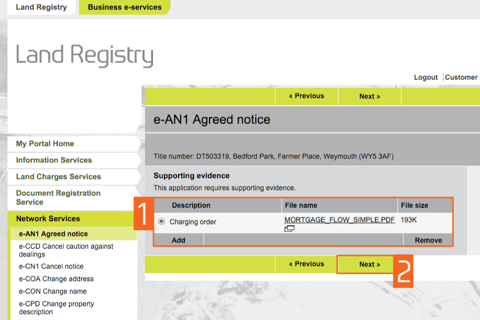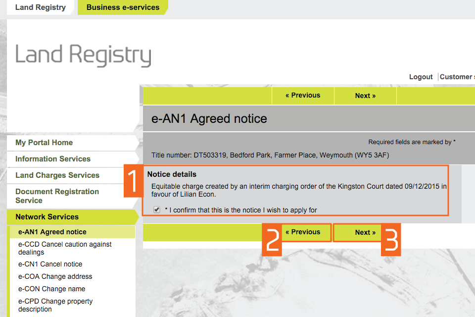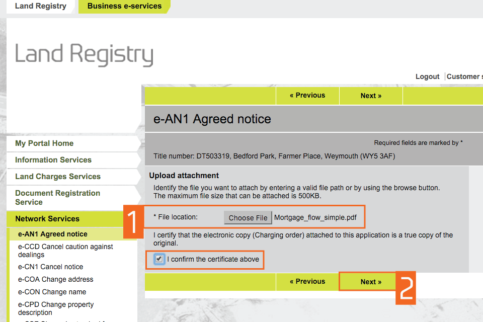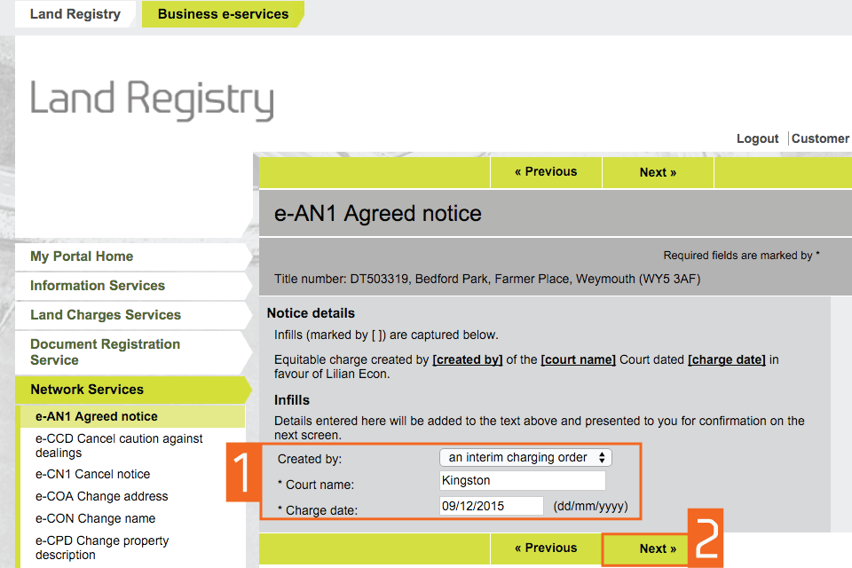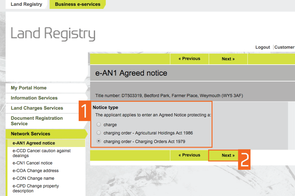 HM Land Registry portal: agreed notice to note a charging order (e-AN1)