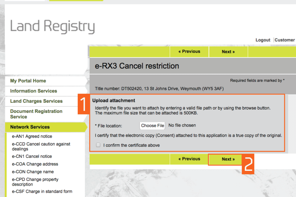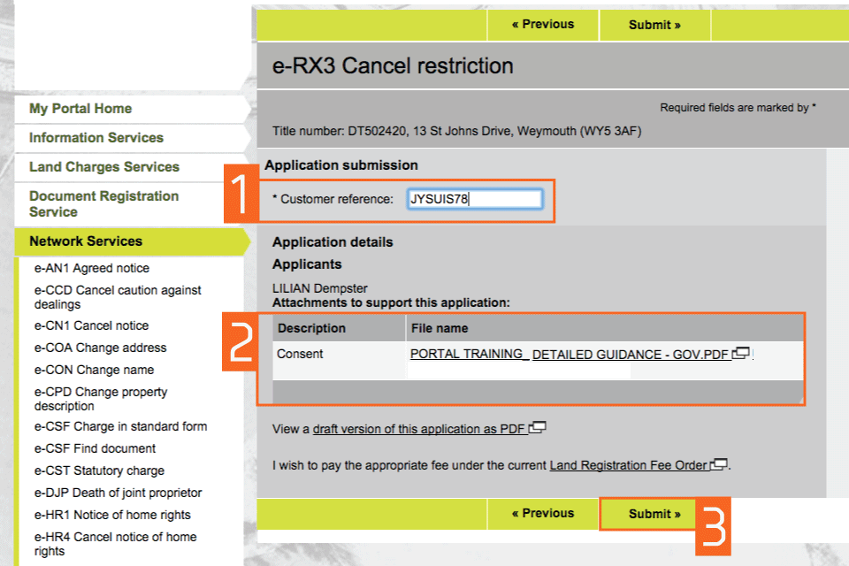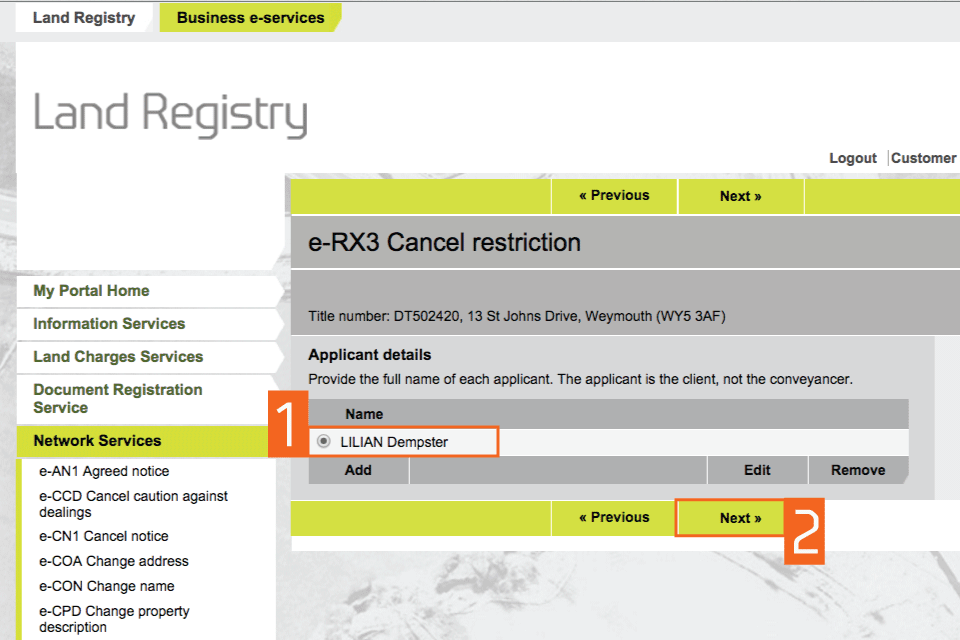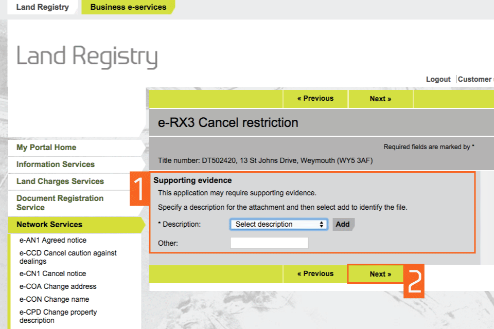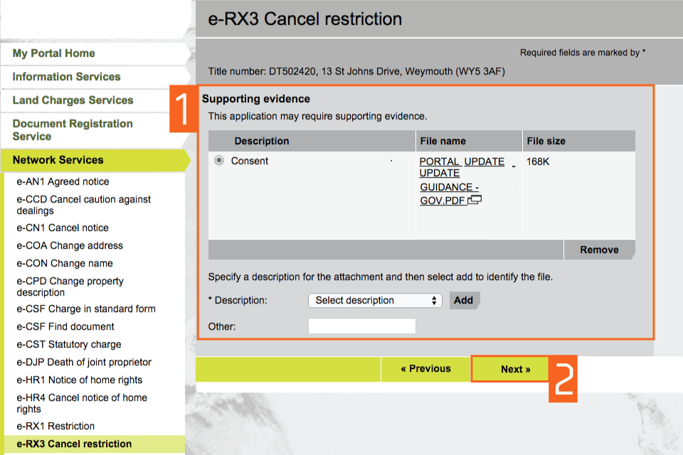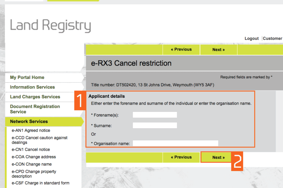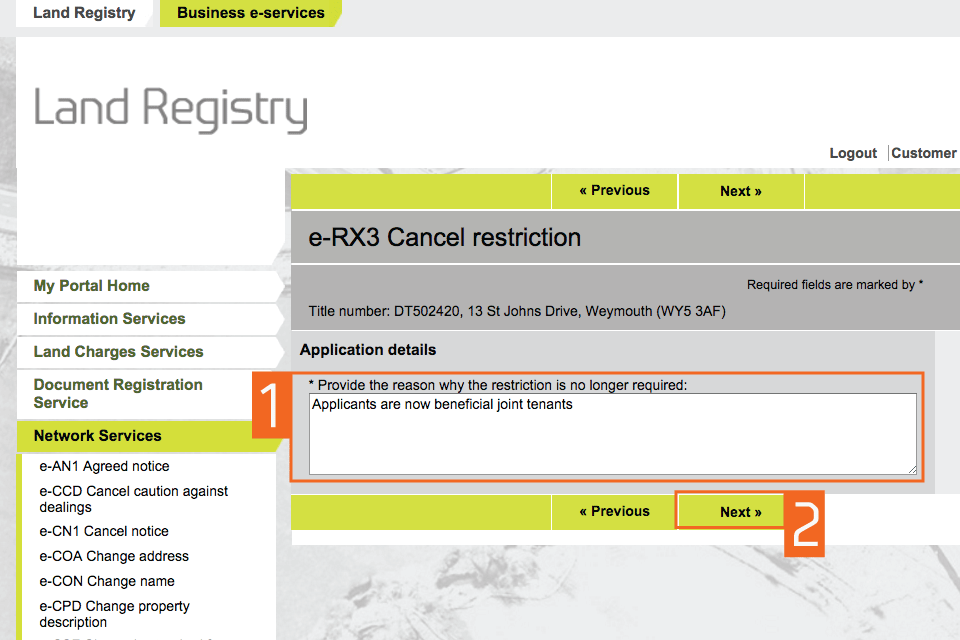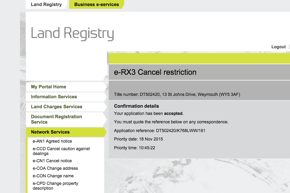 HM Land Registry portal: cancel a restriction (e-RX3)