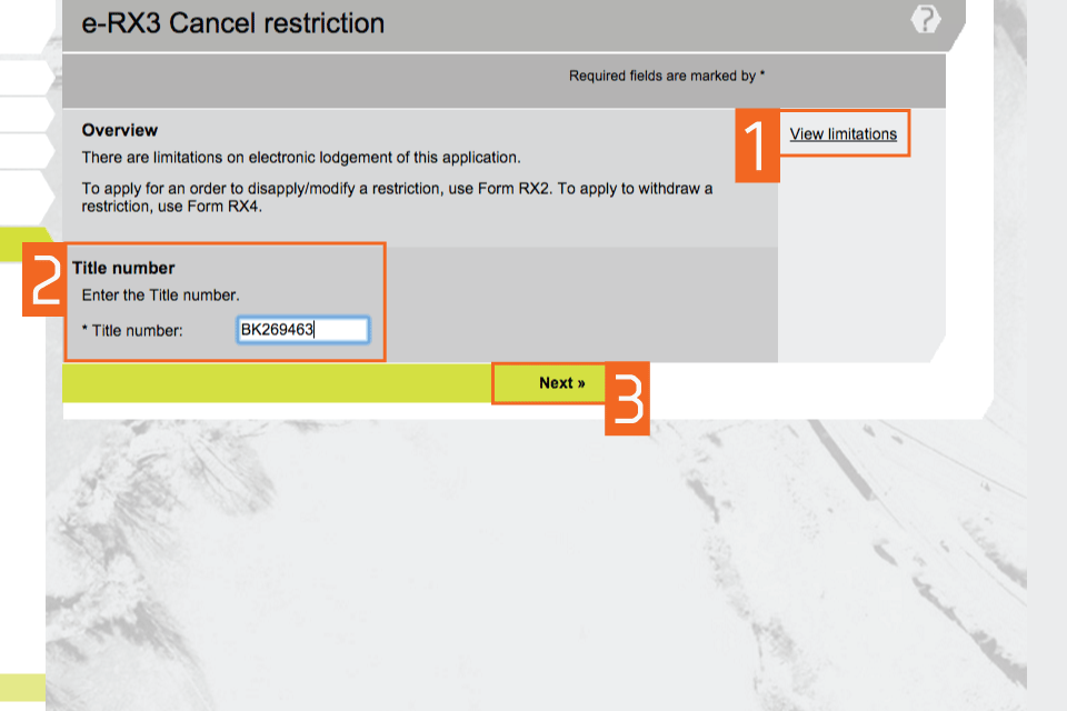 - Some applications to cancel a standard restriction cannot be lodged as an e-RX3. Select ‘View limitations’ to check details.