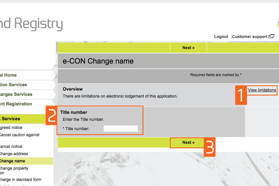- Some applications to register a change of name cannot be lodged as an e-CON. Select ‘View limitations’ to check. If limitations apply, you will need to apply using the Document Registration Service or by post or DX.