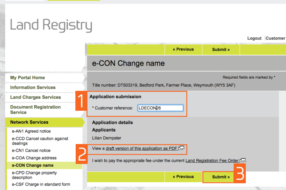 - At the time of publication of this guide there is no fee payable for this application. You may check any fees payable by selecting the link to ‘Land Registration Fee Order. Select ‘Submit’.