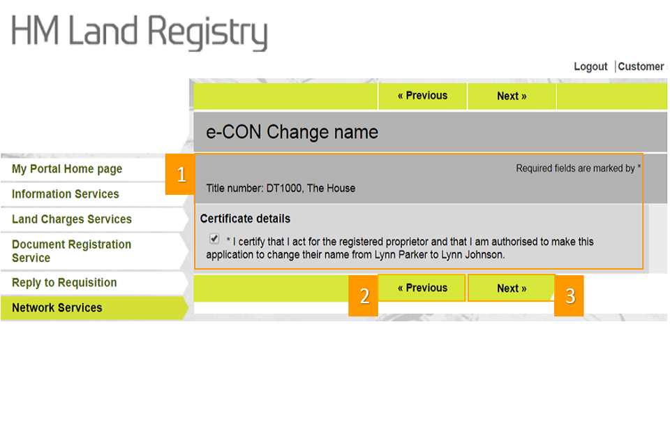 - Select the checkbox to certify that you act for the registered proprietor and are authorised to make the application for the applicant’s change of name.