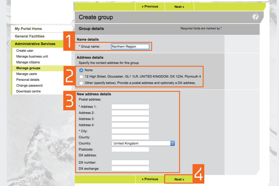 - The ‘Address details’ section gives you 3 options for allocating a contact address to the group. This is a contact address only and not associated to where completed applications are sent: * if you select ‘None’, no contact address will be assigned to the group and group members cannot be contacted collectively. Also, if you select this option you will not be able to add any other contact details in later screens * select the second address option, to assign the business unit address to the group * select ‘Other’ to specify another contact address for the group