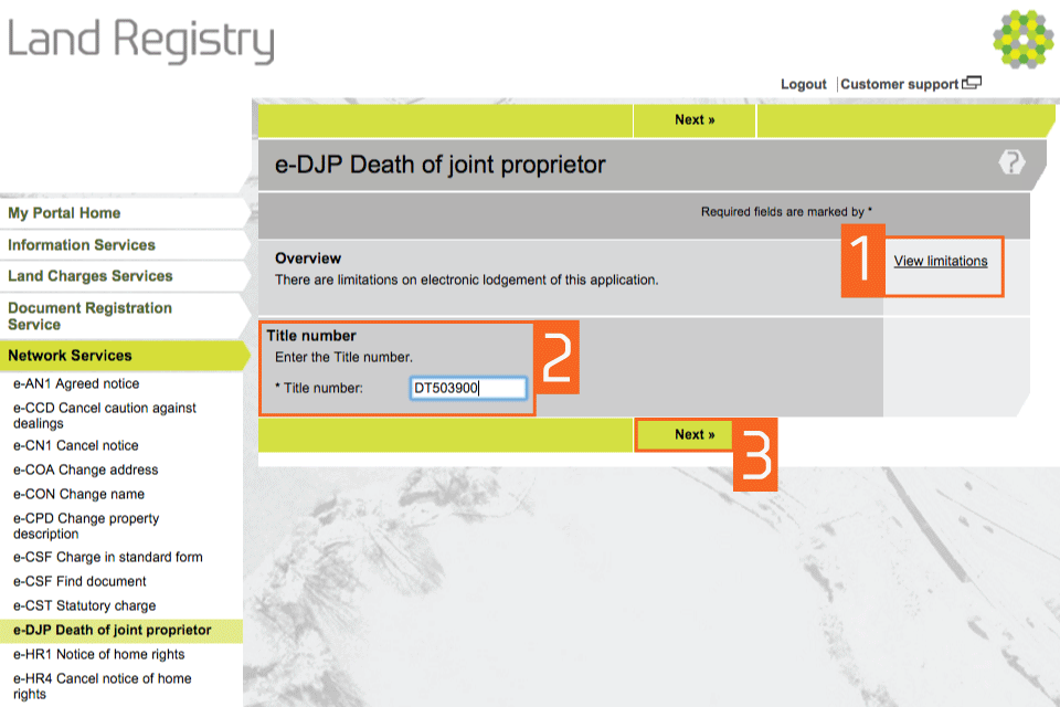 - Some applications to register the death of a joint proprietor can’t be lodged as an e-DJP. Select ‘View limitations’ to check details.