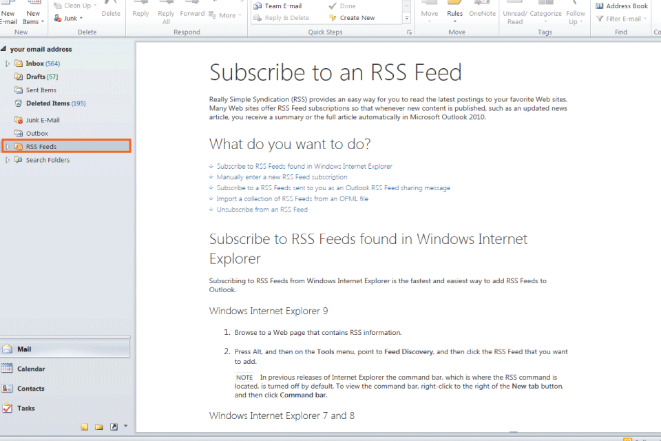 To use Outlook to subscribe to RSS Feeds highlight the URL at the top of the ‘You’ve successfully subscribed to this feed’ page, then Press CTRL+C to copy.