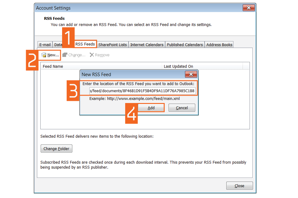 - In the ‘New RSS Feed’ dialog box, type the URL or press CTRL+V to paste the URL of the RSS Feed.