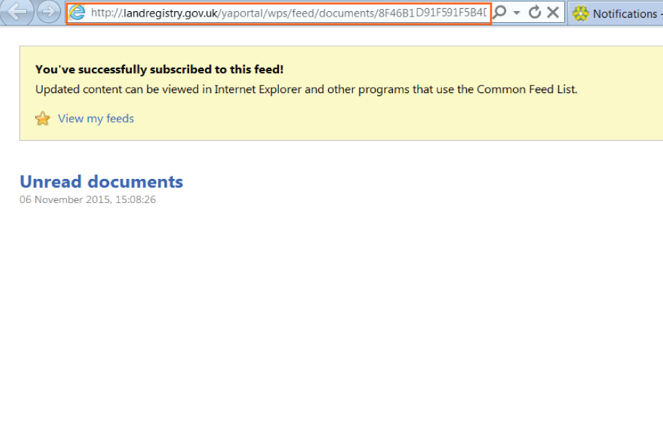- Select ‘Subscribe’. A screen will appear telling you that you’ve successfully subscribed to this feed. You will now receive messages from HM Land Registry alerting you when your ordered documents are in the portal.