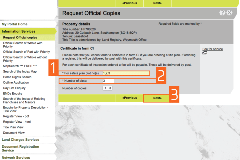 The land must be identifiable on an approved estate plan by a plot number. Form CIs for land without an approved estate plan plot number can’t be requested through portal. Such applications should be made by post.