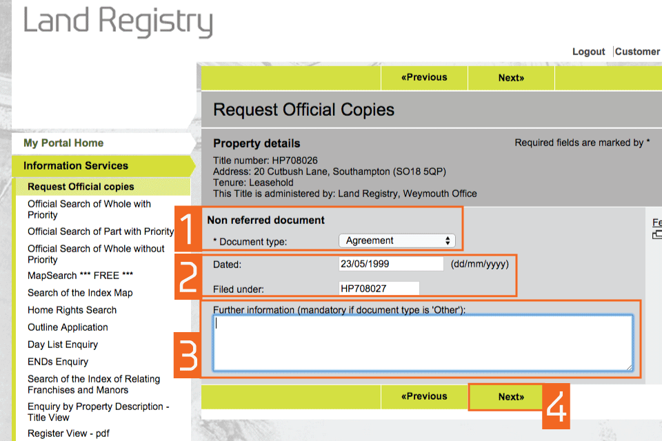 You can enter ‘Further information’ for any document request, eg where you know the parties to a transfer, but not the date. - If required, add a register, title plan or certificate in Form CI to your request. Select ‘Next’.