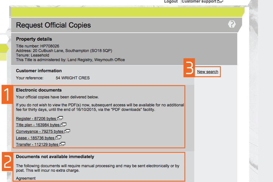 - Documents not available for immediate viewing will only become available after investigation. They will then either appear in ‘PDF Downloads’ under ‘General Facilities’ or be sent by post. Please check your PDF downloads area regularly and before you contact HM Land Registry. 3.Select ‘New Search’ to clear the current request details and make another official copy request.