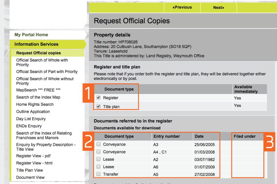 - Select the option: ‘Order official copy of register, title plan and/or documents’.