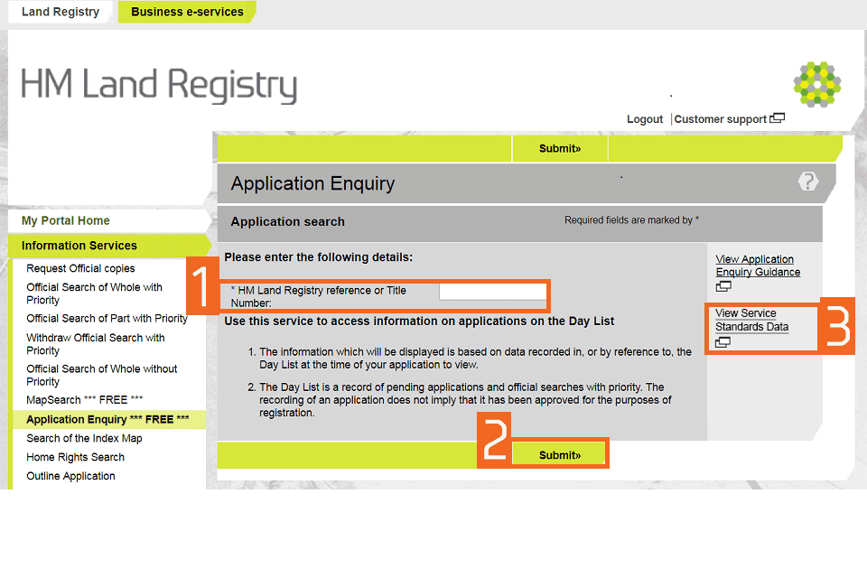 How Business e-services customers can check their current applications to HM Land Registry through the portal.