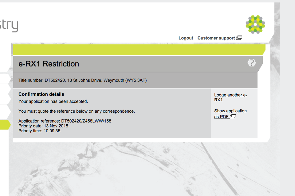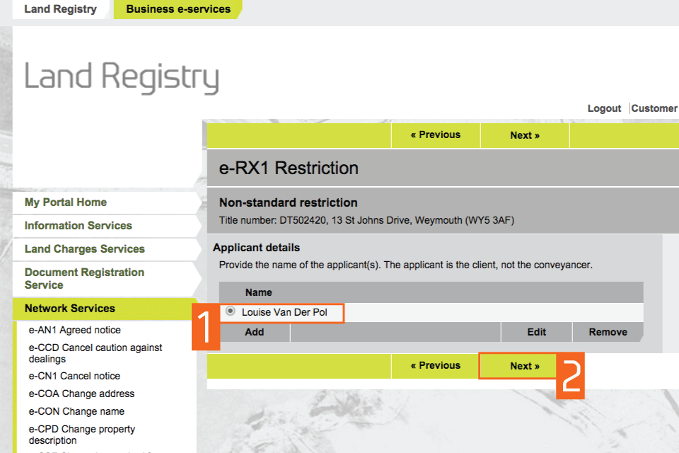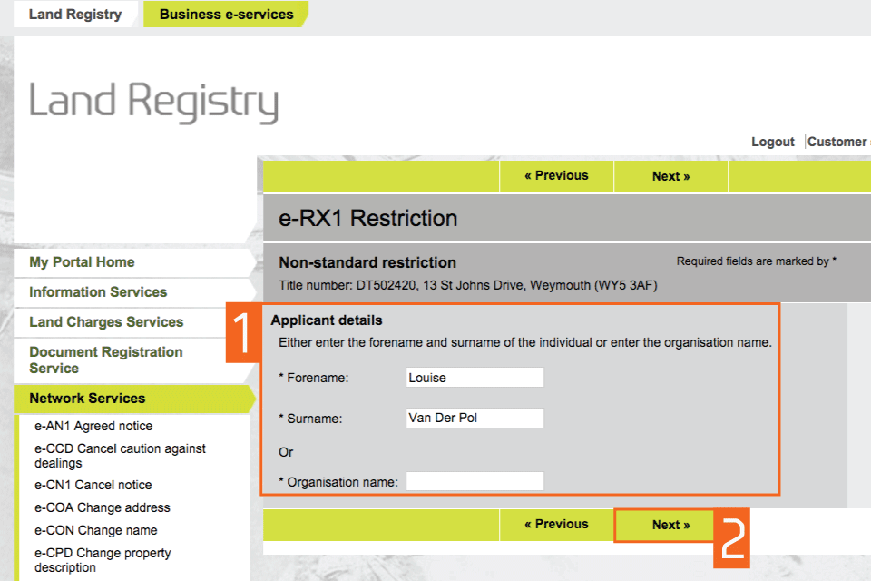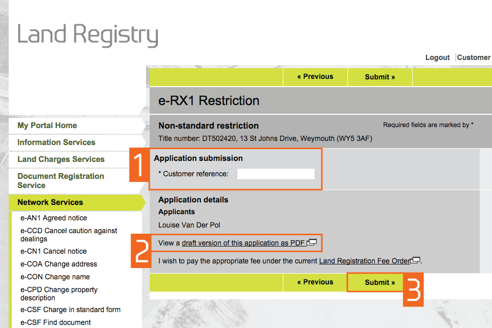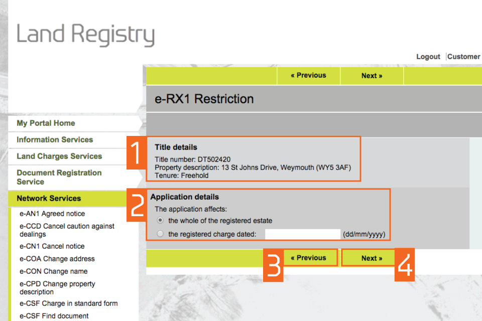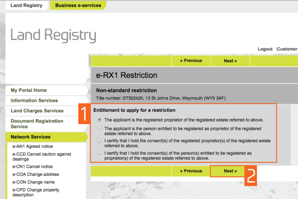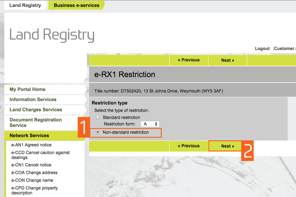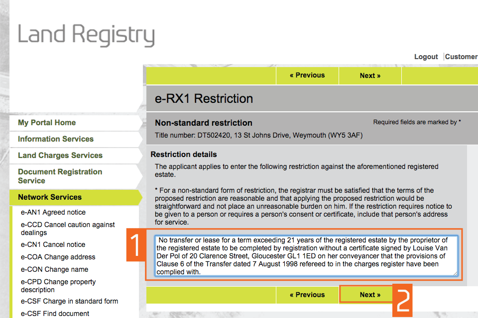 HM Land Registry portal: non-standard restrictions (e-RX1)