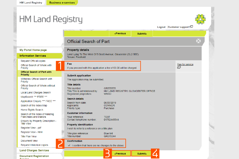 A screenshot of the HM Land Registry business e services portal. Numbers highlight: 1: Fee - If you proceed with this application a fee of £3 will be charged. 2: I confirm that there are no changes to the above. 3: Previous button. 4: Next button