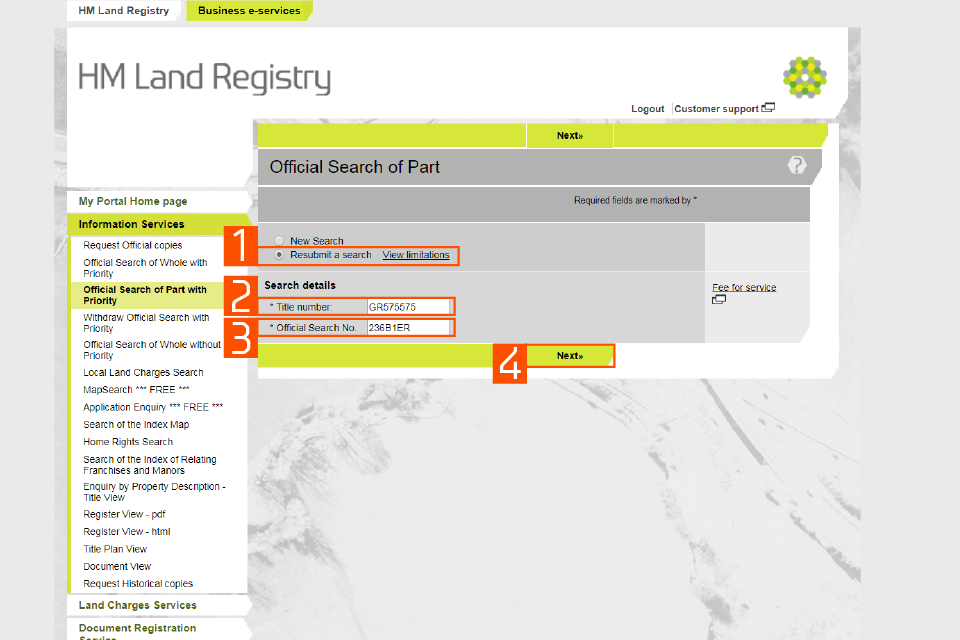 A screenshot of the HM Land Registry business e services portal. There are numbers to highlight areas of the page. 1: Resubmit a search. 2: Title number. 3: Official Search No. 4: Next button