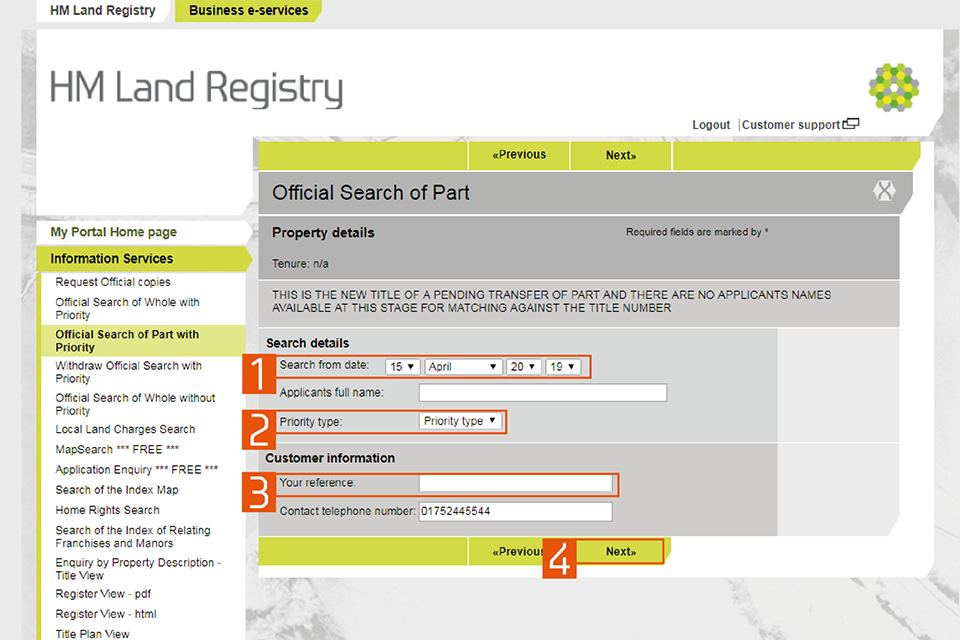 A screenshot of the HM Land Registry business e services portal. Numbers highlight: 1: Search from date. 2: Priority type. 3: Your reference. 4: Next button.
