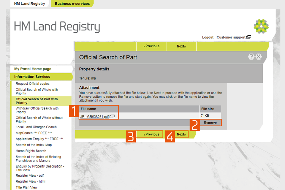 A screenshot of the HM Land Registry business e services portal. Numbers highlight: 1: File name. 2: Remove. 3: Previous button. 4: Next button.
