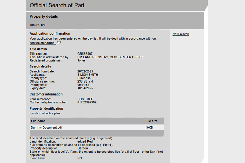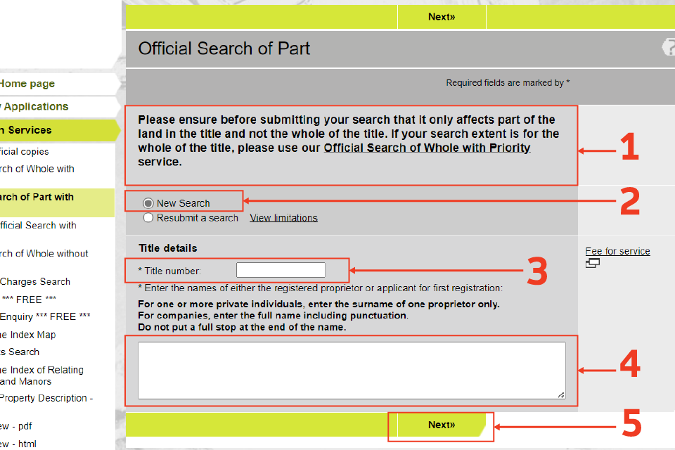 - Please check that you are lodging a search to protect a registrable disposition that affects only part of the land in a registered title or pending first registration, for example, a transfer of part, lease or charge of part. If you are lodging a search that protects the whole of the land, please use our Official Search of Whole with Priority Service.