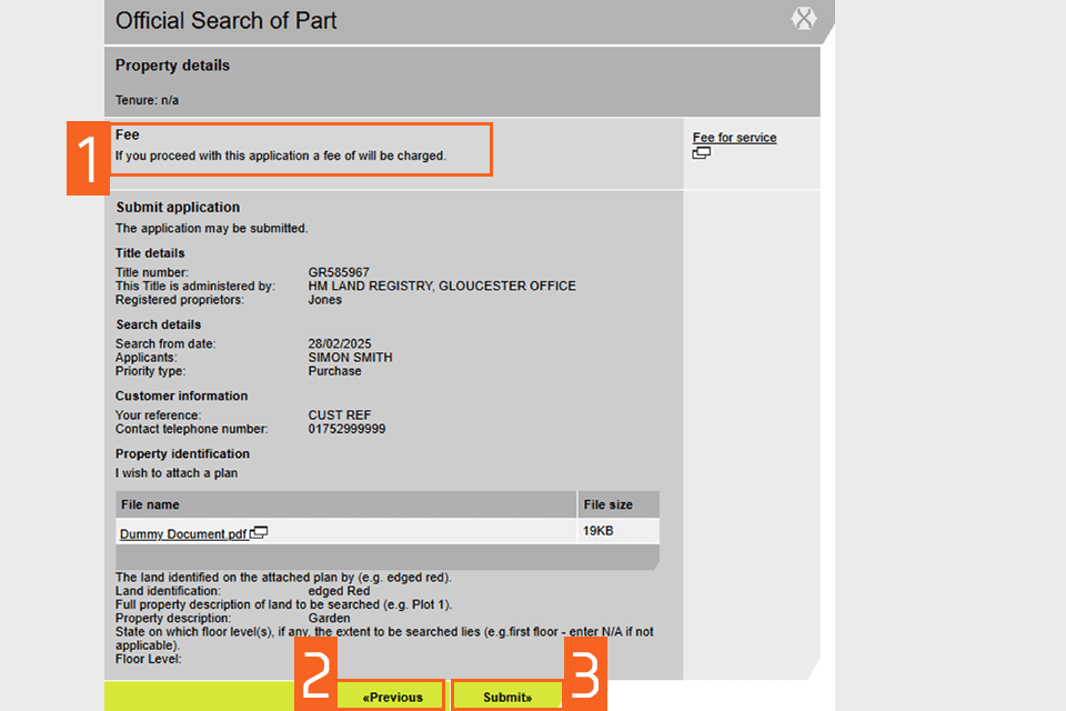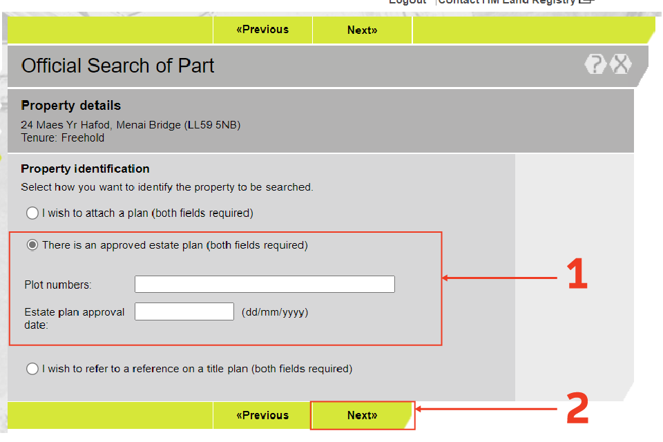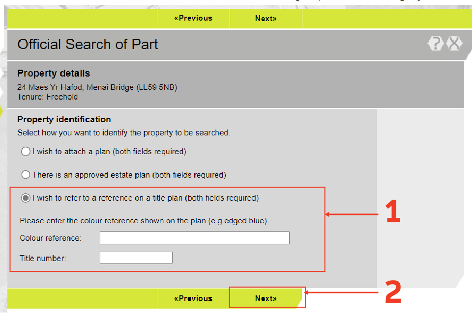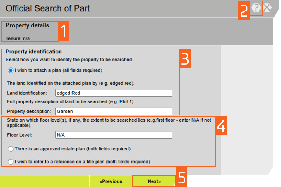 - In the ‘Land Identification’ field enter a reference from the plan (for example ‘edged red’). In Property Description field enter the full verbal address or plot if address is unknown of the land to be searched (for example ‘Plot 1’).