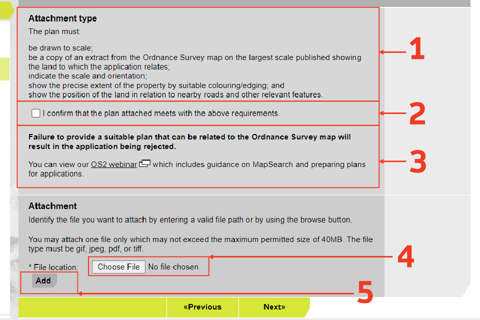 - If you’re attaching a plan to your application, it must meet the same criteria as a paper plan. Select the question mark icon to check the requirements. If a suitable plan isn’t supplied, the application will be rejected unless the property can be identified from an approved estate plan or by description on an existing title plan.
