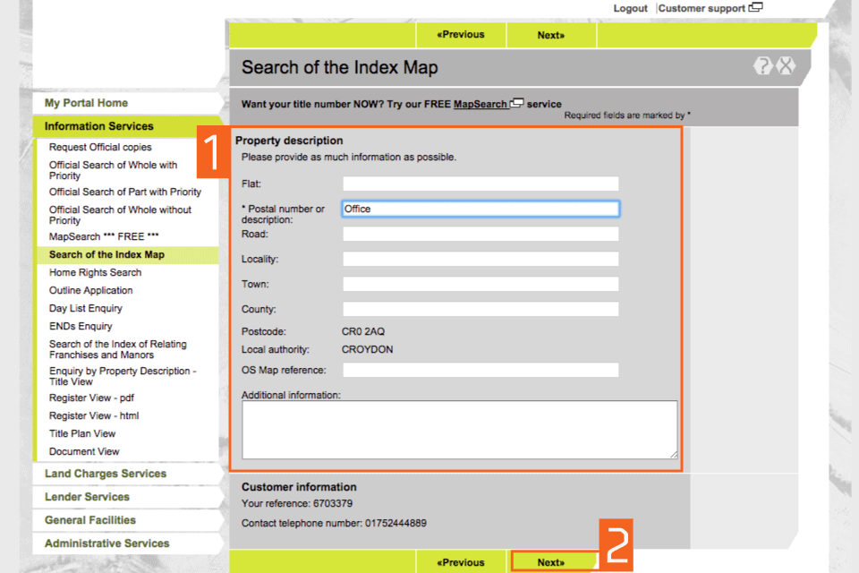 Enter ‘Your reference’ in the ‘Customer information’ section. The reference will be included in your search result. The contact telephone number is pre-populated with the number recorded in your user account. It can be overwritten if you want to change it.