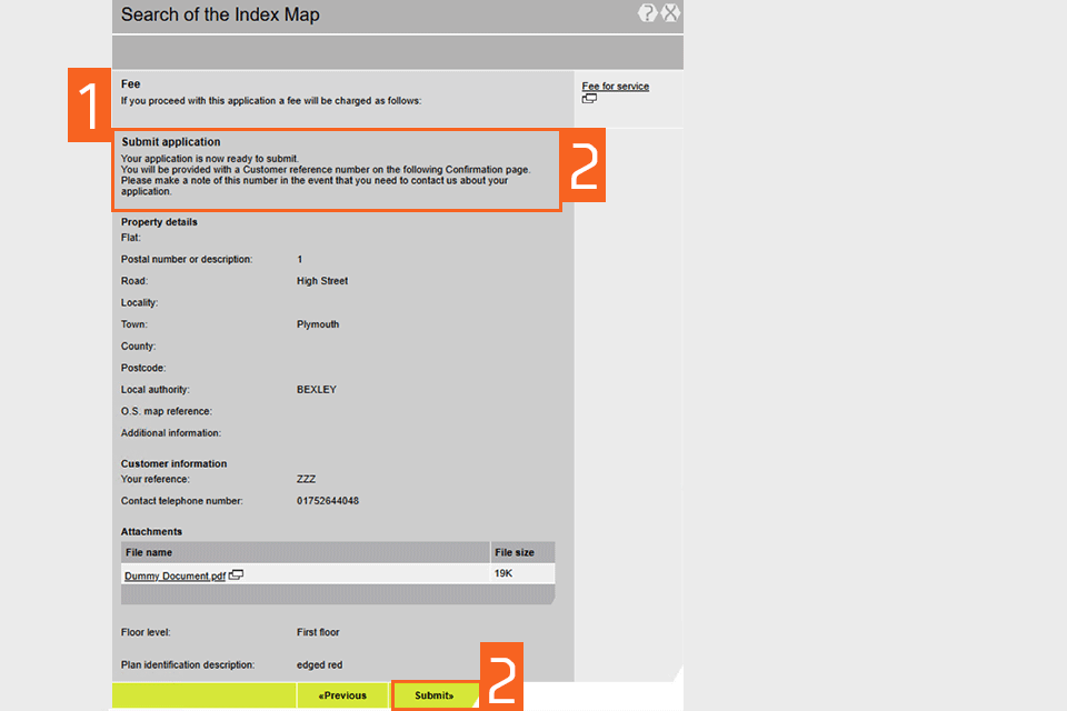 - A summary of your application is shown, including the fee payable. If you want to amend any of the details, select ‘Previous’ to go back and change them. The fee(s) will not be debited from your account when you select submit, but on our completion of the application.