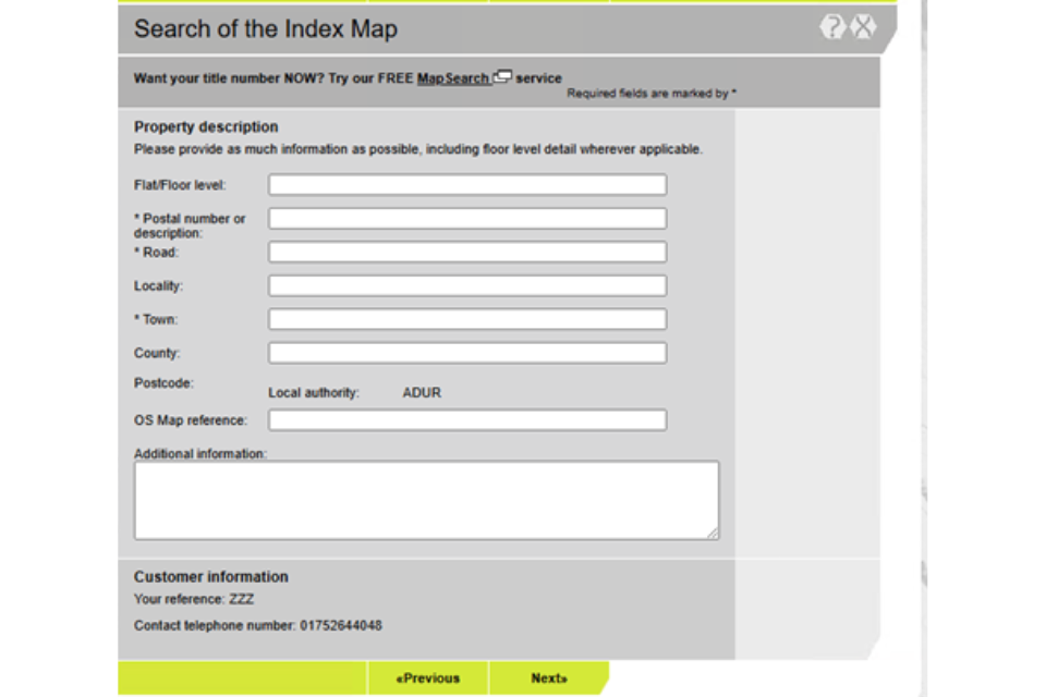 Note: Select ‘Mapsearch’ on the right hand side of the screen to get title number immediately. MapSearch is a free service.