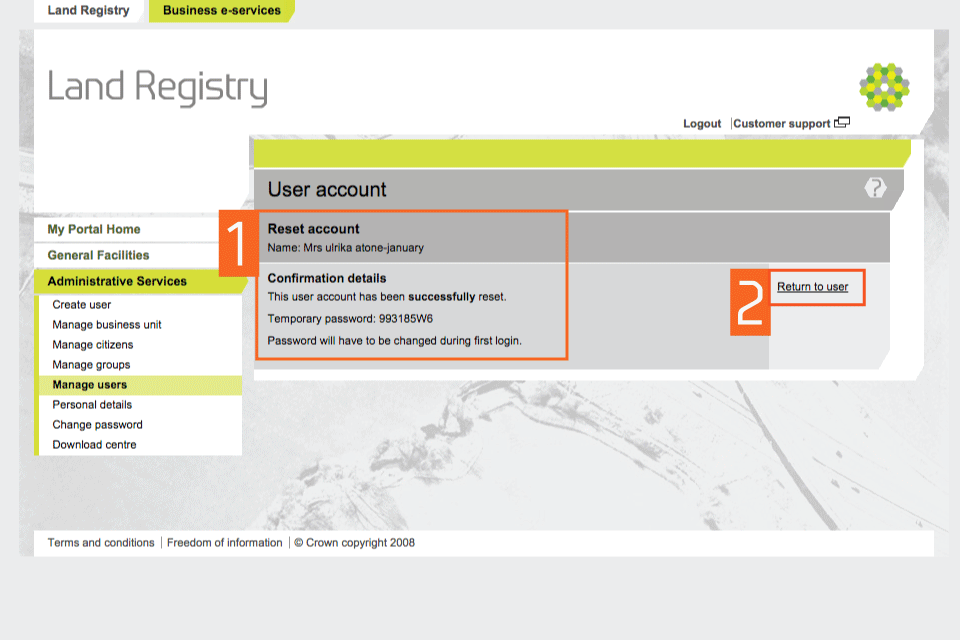 - A message confirms that the user account has been successfully reset. Write down the temporary password. When you give the new password to the user they need to login, change the password and reset their shared secrets in the same way as when they first registered.