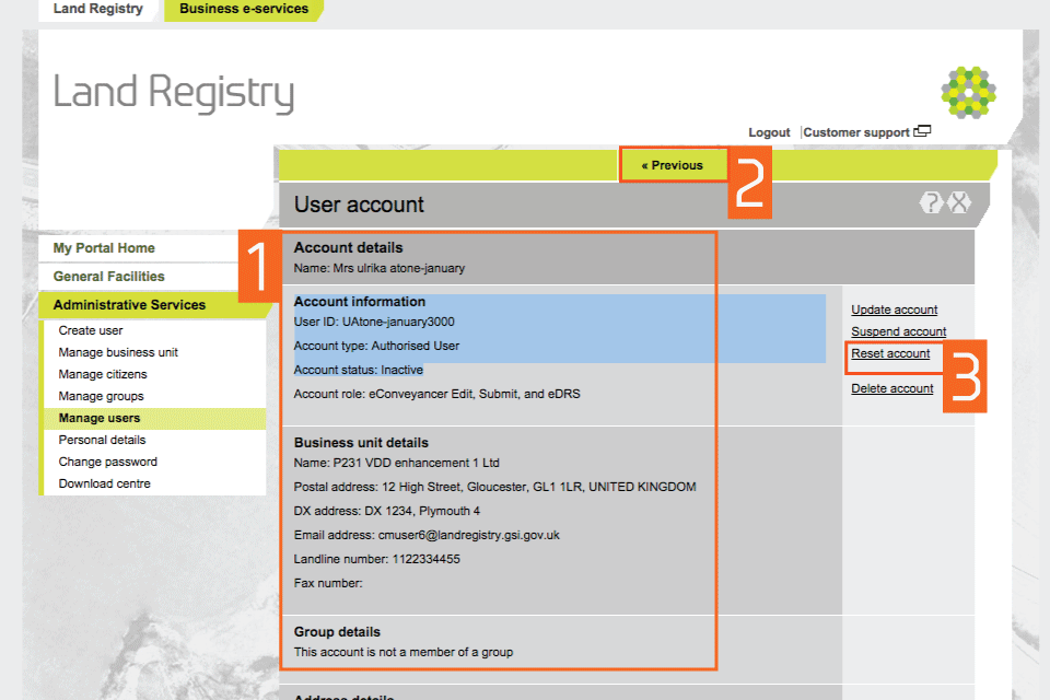 How Business e-services customers (business unit administrator role) can reset a user account through the portal.