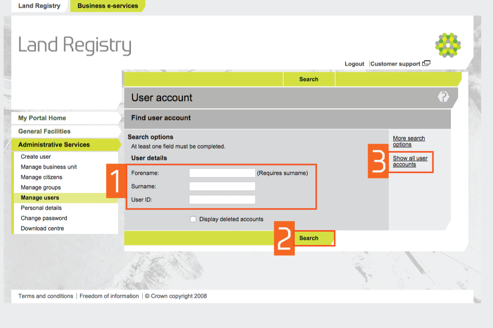 - Enter a ‘Surname’ or ‘User ID’ (Username). If your business unit has more than one person with the same surname, enter their ‘Forename’ to narrow the search results.