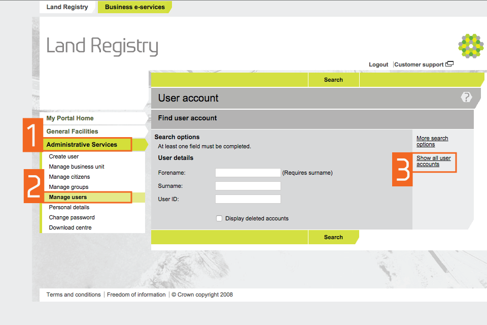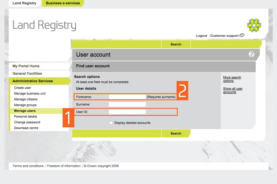 How Business e-services customers (Business Unit Administrator role) can search and view user accounts through the portal.