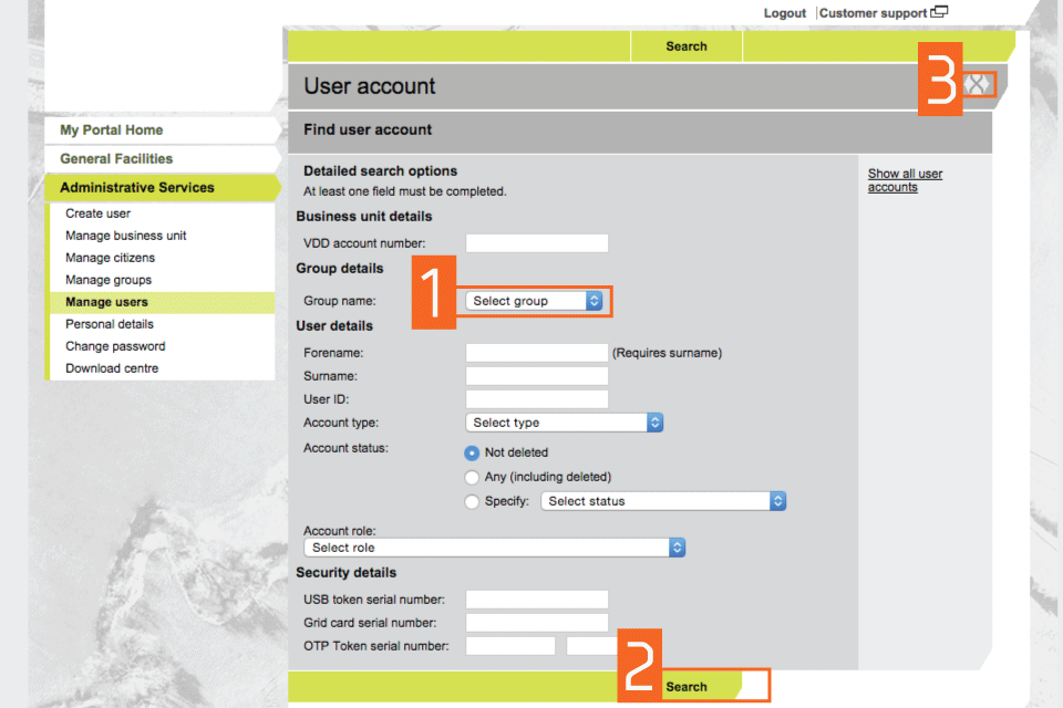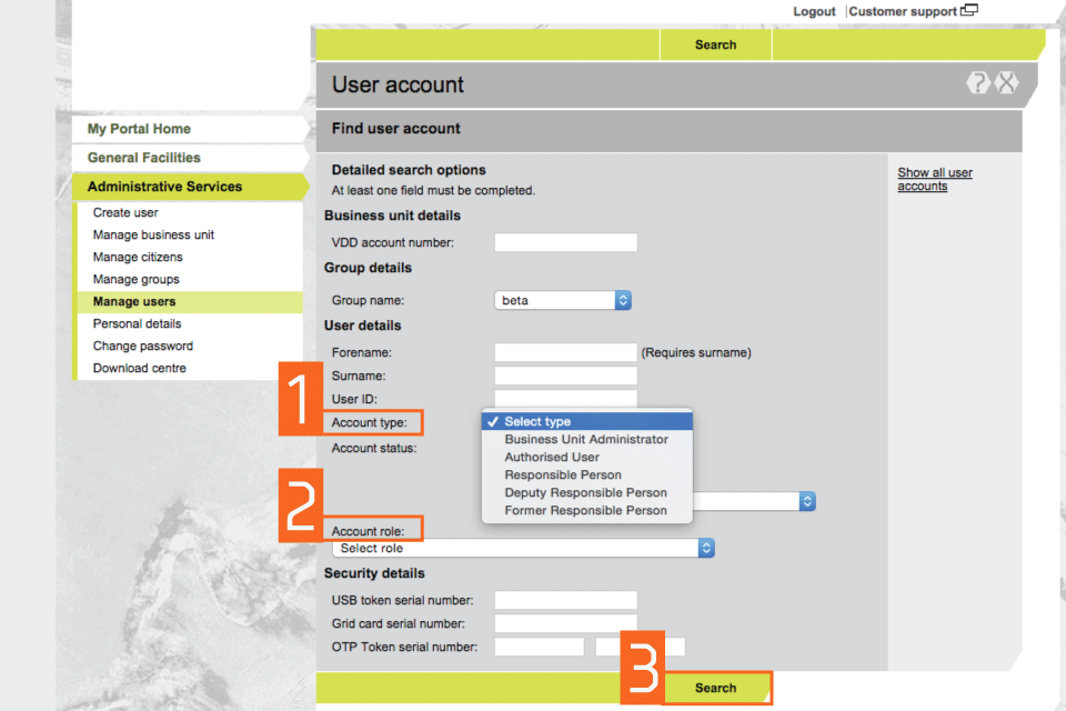 - Use the ‘Account type’ drop down menu to search for users with the same ‘Account type’, eg all Business Unit Administrators or Authorised Users.
