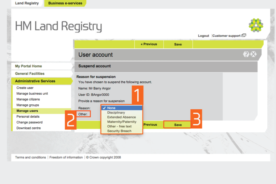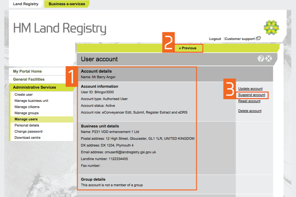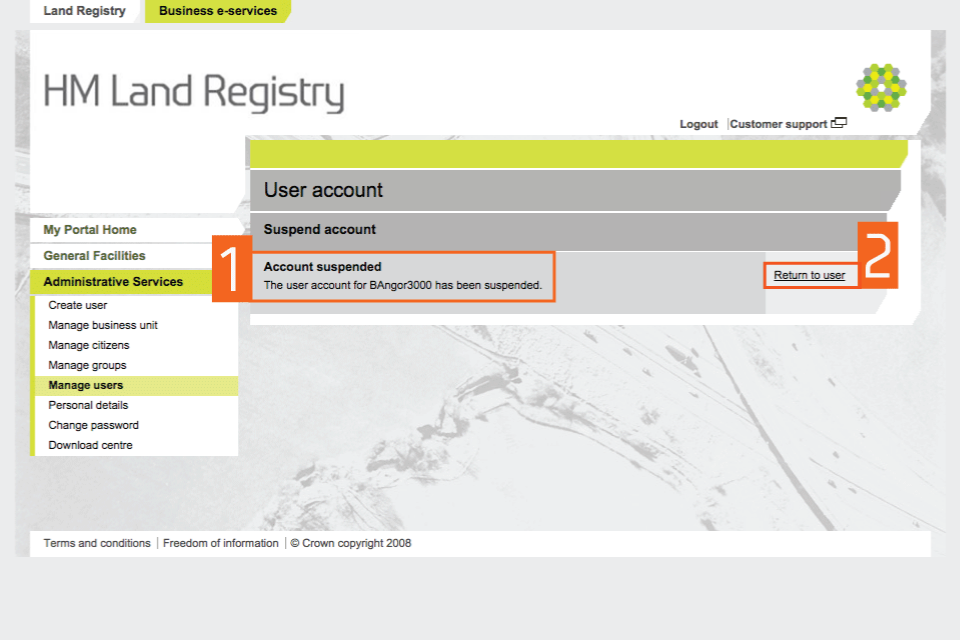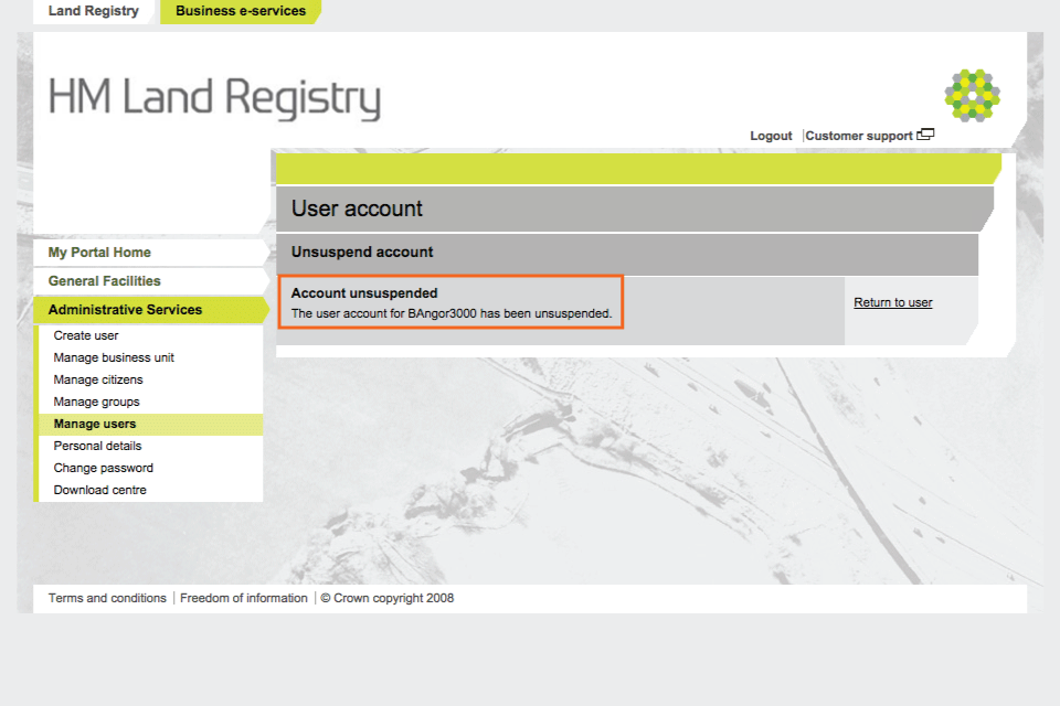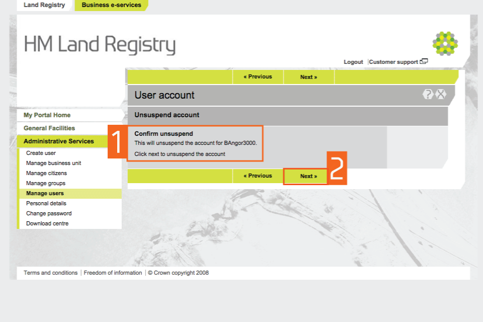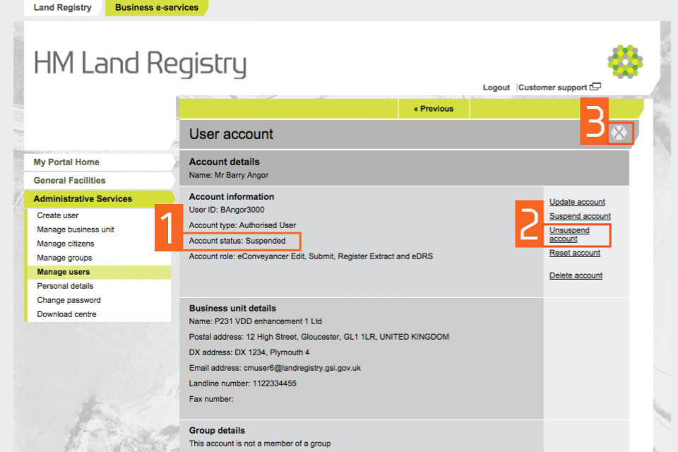 - Select ‘Unsuspend account’. If the account has been suspended by HM Land Registry, you won’t be able to unsuspend it and will need to contact your customer team (if you have one) or use our online contact form to ask for it to be restored.