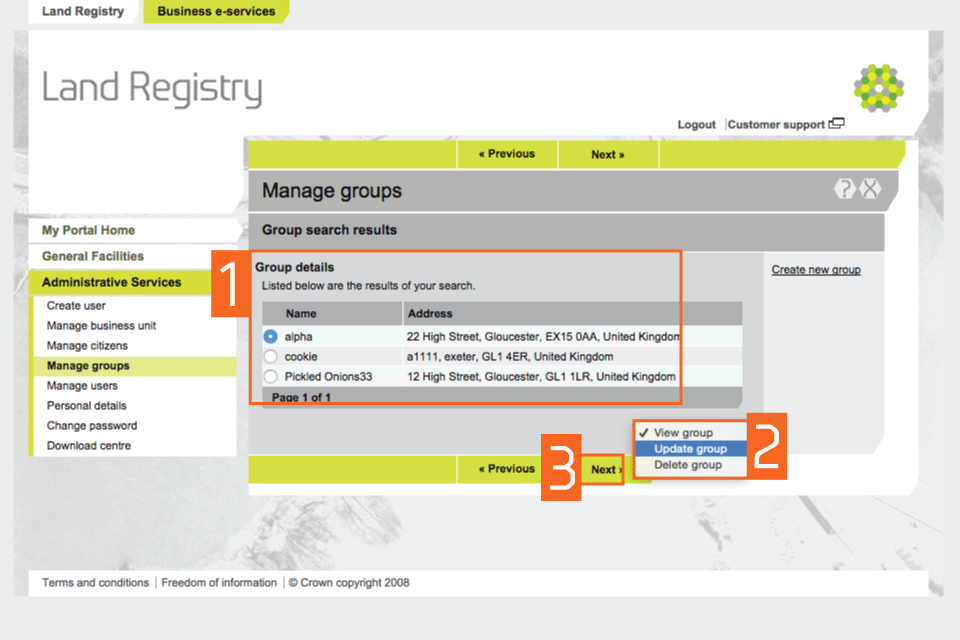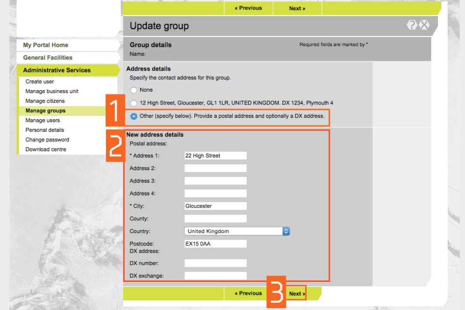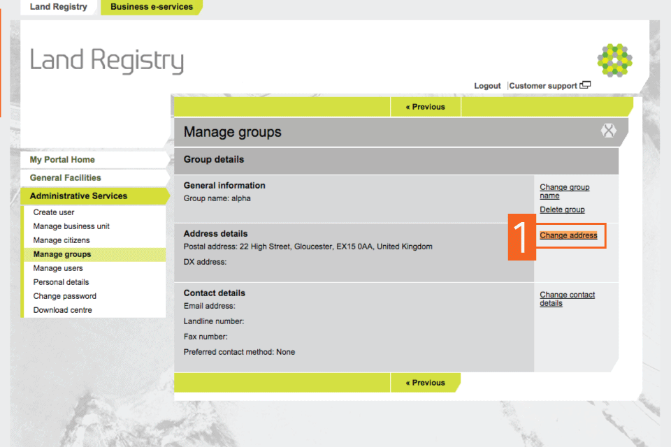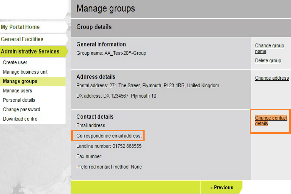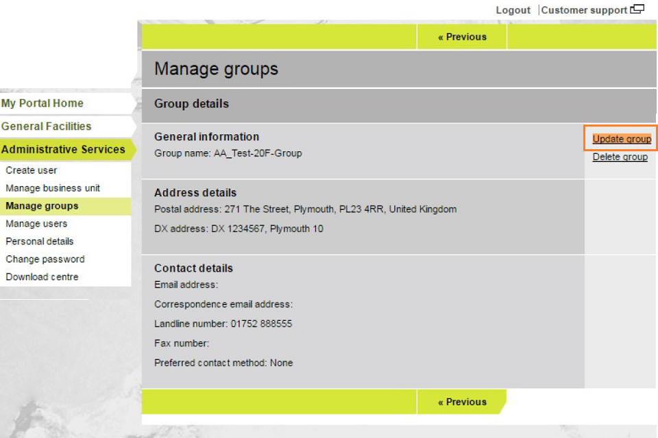 How Business e-services customers (business unit administrator role) can update a group address, add or update group email address, through the portal.