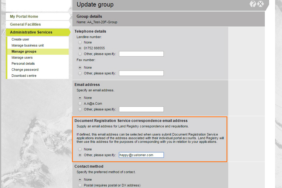 Select ‘Document Registration Service Correspondence email address’ and supply an address for HM Land Registry correspondence and requisitions. Select ‘Save’.