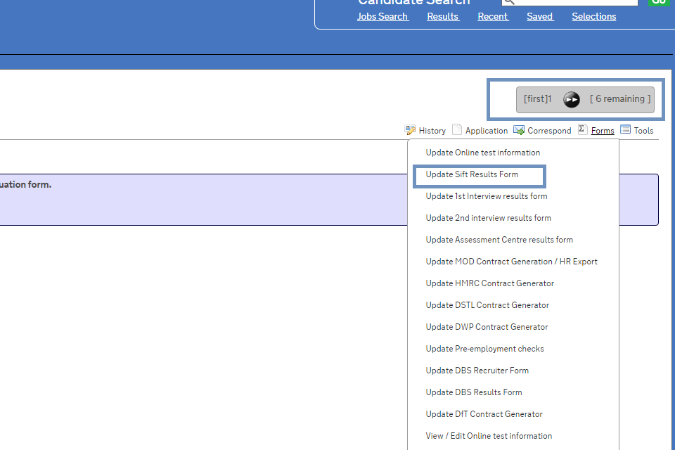 Select “Forms > Update Sift Results Form”. Complete the relevant form fields and select “Update”. Vacancies using Success Profiles will use the “Update Sift Feedback Form SP”.