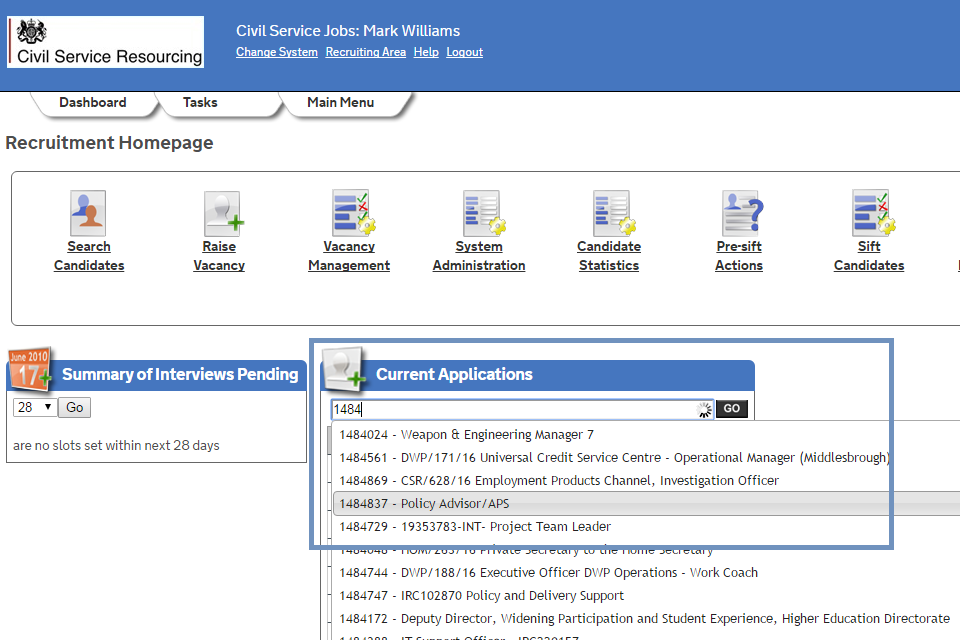 On your dashboard’s “Current Applications” section, filter the results using your vacancy reference number or title (if you have access to more than one vacancy).