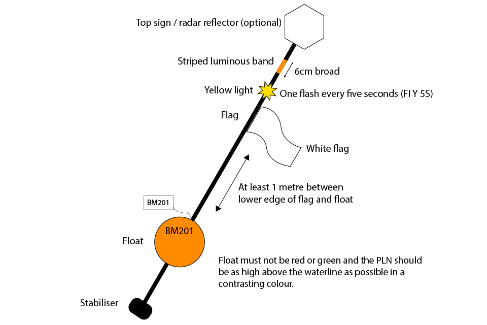 - lights: must be yellow and flash once every 5 seconds (F1 Y 5S) and be visible from a minimum distance of two nautical miles