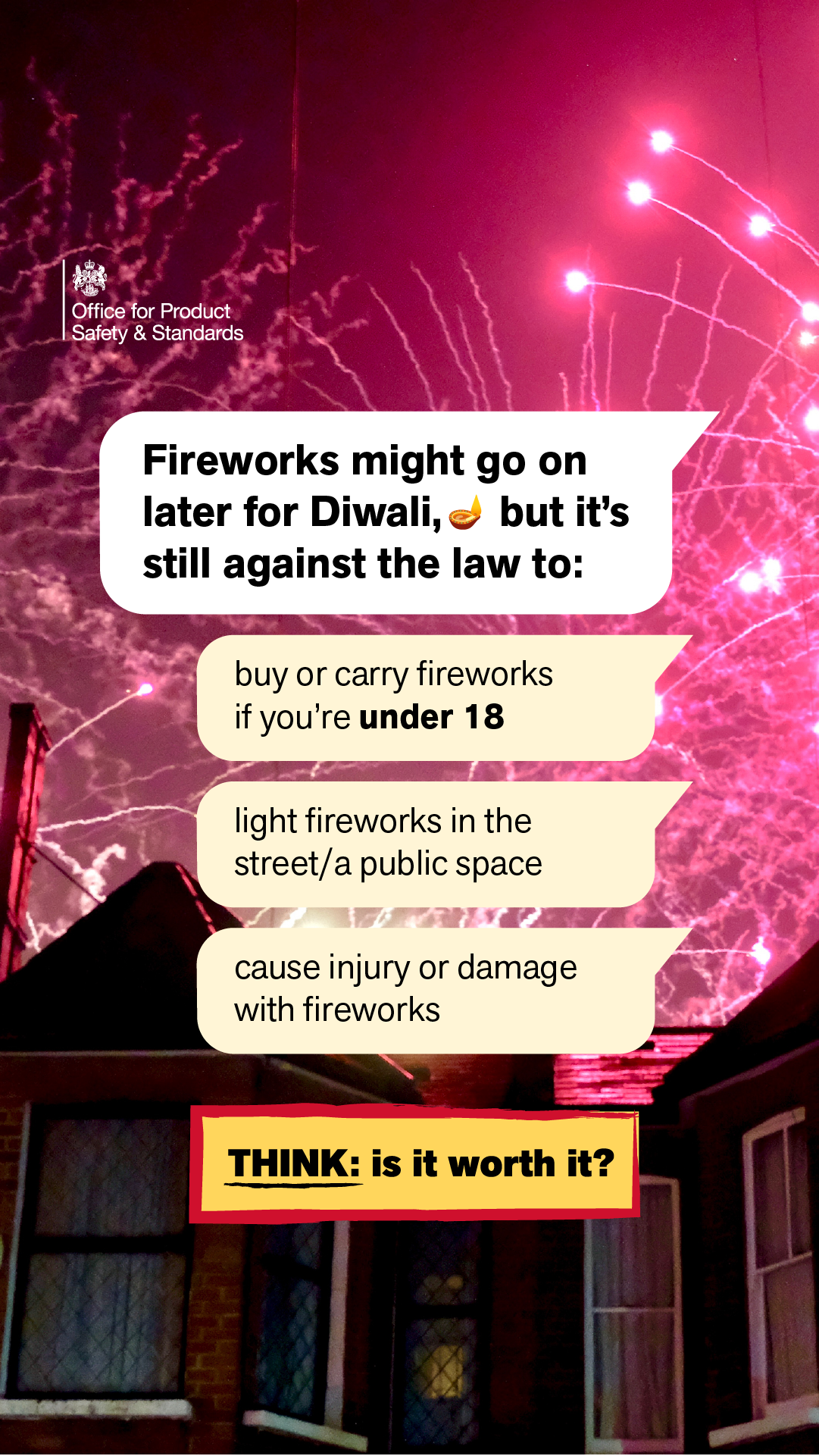 - Firework may go on later for Diwali, but it’s still against the law to: buy or carry fireworks if you’re under 18, light fireworks in a street / a public place, cause injury or damage with fireworks – THINK: is it worth it?