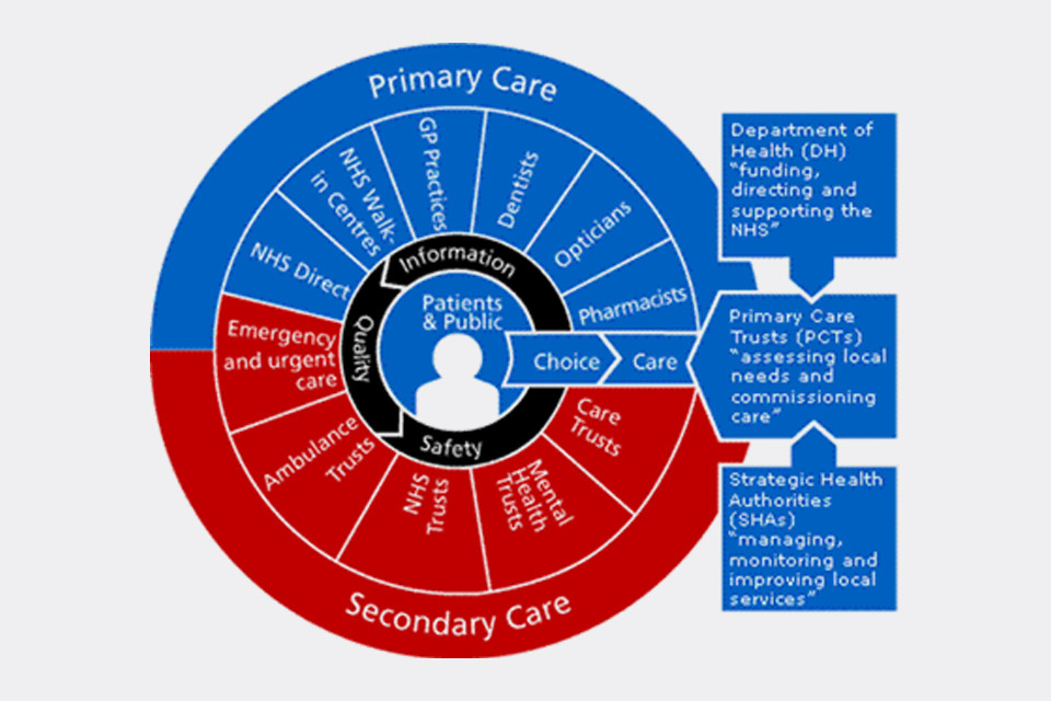 Diagram of the structure of The National Health Service (England), showing how Primary Care and Secondary care are separated.