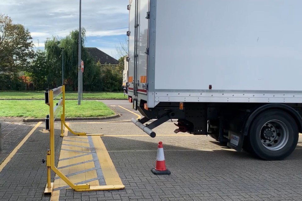 The barrier behind the yellow stopping area which simulates reversing up to a loading platform.